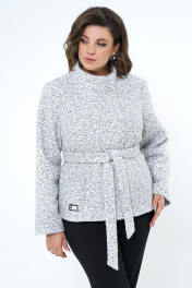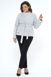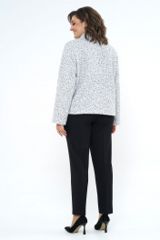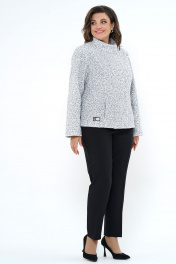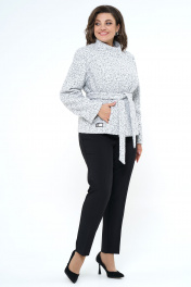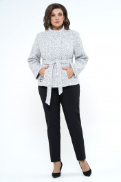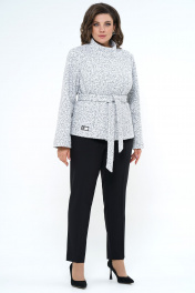 Жакет женский полуприлегающего силуэта, на подкладке, с поясом, с двух-бортной застёжкой на потайные кнопки. Перед с рельефными швами в рельефных швах кармана. Спинка со средним швом. Рукава втачные, одношовные, длинные. Воротник стойка застёгивающаяся на потайную кнопку. Брюки полуприлегающего силуэта, на притачном поясе по боковым на резинке, застёжка типа «гульфик» на молнию и по краю пояса на петлю и пуговицу. Передние части с имитацией бокового кармана. Задние части с талевыми выточками.