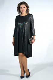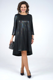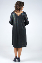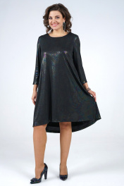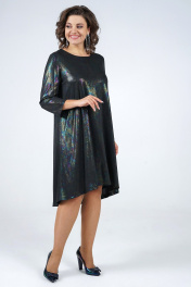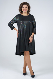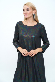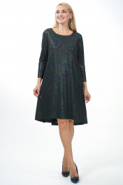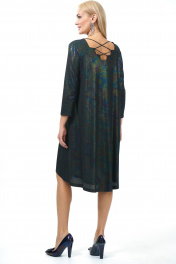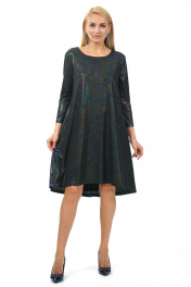 Платье расширенного силуэта, на подкладке, низ фигурной формы разноуровневый. Рукава втачные, одношовные, длиной ¾. Горловина по спинке фигурной формы и с переплетением из рулика основной ткани.