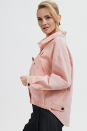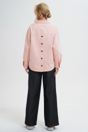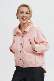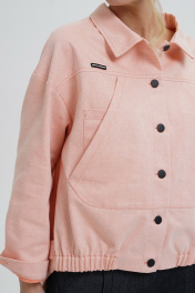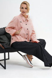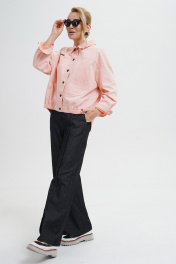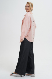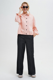 Жакет свободного прямого силуэта, со спущенной линией плеча, с разноуровневым низом, по низу переда резинке, с застёжкой по переду и спинке на пробивные петли и пуговицы, понизу боковых швов спинки паты, пристегивающиеся на пробивные петли и пуговицы. По переду и спинке притачные кокетки. Перед с накладными нагрудными карманами. Рукава втачные, двухшовные, длинные, понизу с разрезом, мягкой складкой и притачными манжетами на пробивную петлю и пуговицу. Воротник отложной. Брюки прямого силуэта, на притачном поясе со шлёвками, с застёжкой типа «гульфик» на молнию и по краю пояса на петлю, пуговицу, в боковых швах карманы. Передние части с отстроченными складками и имитация горизонтальных карманов с листочкой. Задние части с талевыми выточками