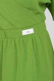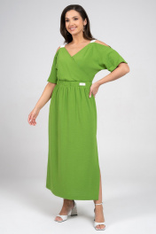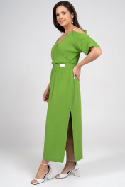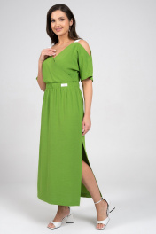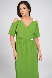 Платье прямого силуэта, отрезное по линии талии с поясом на резинке, на широких бретелях (выполнены из отделочной ткани), с открытым плечевым поясом, с цельнокроеными короткими рукавами, по левому боковому разрез. Перед вверху на запах. Спинка со средним швом. Нижняя часть по линии талии дополнительно с небольшой сборкой.
