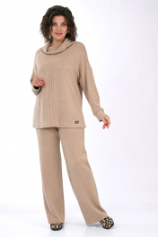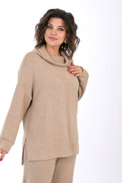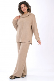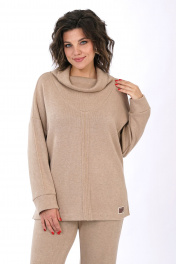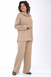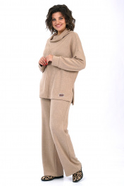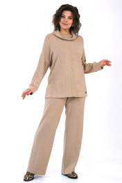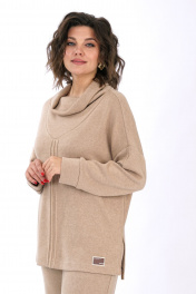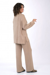 Комплект женский 2-х предметный состоит из блузона и брюк. Блузон прямого, свободного силуэта, со спущенной линией плеча, с разноуровневым низом, с разрезами по боковым. Перед, рукава с декоративными защипами. Рукава втачные, одношовные, длинные понизу с притачными манжетами. Горловина фигурной формы с притачным воротником по форме «хамут». Брюки прямого силуэта, с притачным поясом на резинке. Задние части с талевыми выточками.