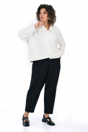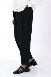Комплект женский 2-х предметный состоит из жакета и брюк. Жакет прямого, свободного силуэта, с застёжкой на петли, пуговицы, со спущенной линией плеча, с фигурной линией низа и притачным поясом. Рукава втачные, одношовные, длинные, понизу со сборкой, притачными манжетами. Воротник отложной. Брюки типа «банан», с притачным поясом по боковым на резнике, с застёжкой типа «гульфик» на молнию и по краю пояса на петлю, пуговицу. С конструктивной выточкой понизу передних и задних частей. Передние части с боковыми карманами, с мягкой застроченной складкой выходящей от входа кармана. Задние части с талевыми выточками и мягкой застроченной складкой от верха.