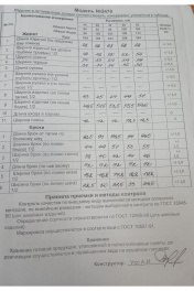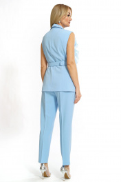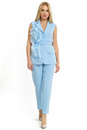 Жилет полуприлегающего силуэта, с застёжкой на петли, пуговицы, в дополнении с ремнем. Декорированный по переду воланами (выполненные из отделочной ткани органза). Перед с рельефными швами и декоративным клапаном. Спинка со средним швом и рельефными швами. Воротник отложной с отворотом. Брюки полуприлегающего силуэта, со сгибом, с притачным поясом, с застёжкой типа «гульфик» на молнию и петли, пуговицы по краю пояса. Передние части с имитацией косых боковых карманов. Задние части с талевыми выточками.