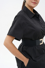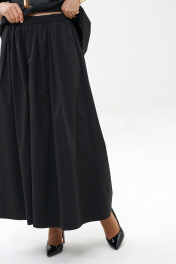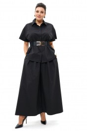 Комплект женский 2-х предметный состоит из блузки и юбка-брюки. Блузка прямого свободного силуэта, с застёжкой на петли, пуговицы, со спущенной линией плеча, с фигурной линией низа. В дополнение ремень. Перед с притачными кокетками. Спинка с притачной кокеткой и мягкой складкой по шву соединения. Рукава втачные, одношовные, короткие. Воротник стояче-отложной на отрезной стойке. Юбка-Брюки широкие свободного силуэта, с притачным поясом на резинке. Передние части с мягкими складками от пояса и косыми боковыми карманами.
