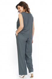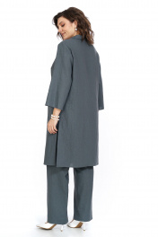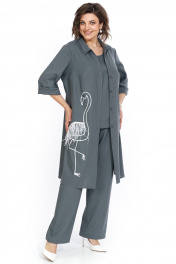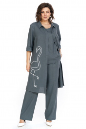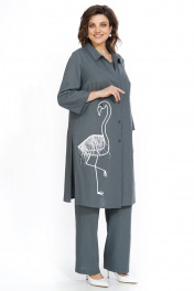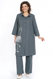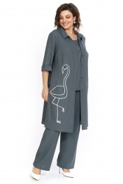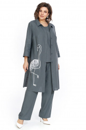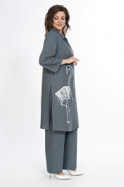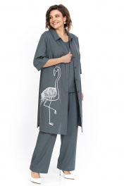 Блузон прямого силуэта с застёжкой по притачной планке на петли, пуговицы, по боковым с разрезами. Перед с нагрудными выточками, по правой части печать со съёмной тесьмой с перьями фиксируемая на пришивных кнопках. Рукава втачные, одношовные, длиной ¾. Воротник стояче-отложной. Блуза полуприлегающего силуэта, с фигурной линией низа. Перед с нагрудными выточками. Брюки свободного, прямого силуэта, с притачным поясом на резинке. Передние части с боковыми, косыми карманами.