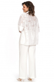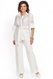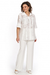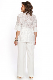 Комплект женский 2-х предметный состоит из блузки и брюк. Блузка прямого, свободного силуэта, с застёжкой по притачной планке на петли, пуговицы, со спущенной линией плеча. Перед с нагрудными выточками и накладными нагрудными карманами. Рукава втачные, одношовные, короткие, понизу с притачными манжетами и с разрезом по шву. Воротник стояче-отложной на отрезной стойке застёгивающаяся на петлю, пуговицу. Брюки прямого силуэта, со сгибом, с притачным поясом по боковым на резинке, с застёжкой типа «гульфик» на молнию и петли, пуговицы по краю пояса. Передние части с имитацией косых боковых карманов. Задние части с талевыми выточками.