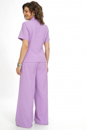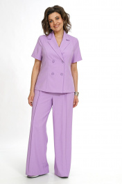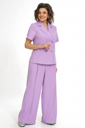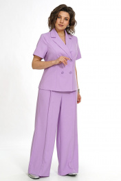 Комплект женский 2-х предметный состоит из жакета и брюк. Жакет полуприлегающего силуэта, с двух-бортной застёжкой на петли, пуговицу и с внутренней застёжкой на потайную петлю и пуговицу. Перед с отложными лацканами, с рельефными швами. Спинка со средним швом и рельефными швами. Рукава втачные, одношовные, короткие. Воротник отложной с отворотом. Брюки прямого силуэта, на притачном поясе со шлёвками по боковым на резинке, с застёжкой типа «гульфик» на молнию и по краю пояса на петлю, пуговицу, в боковых швах карманы. Передние части по сгибу с отстроченными складками. Задние части с талевыми выточками.