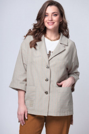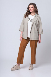 Костюм женский, трехпредметный, состоящий из жакета, топа и брюк. Жакет прямой с центральной застежкой на 3 петли и пуговицы, пиджачным воротником и асимметричной линией низа. Перед с нагрудными вытачками, отрезными бочками и накладными карманами. Спинка с кокеткой и средним швом, рукава рубашечного покроя. Топ из трикотажного полотна с вышивкой по переду и цельнокроеными рукавами. Брюки прямые слегка зауженные книзу, с боковыми карманами и притачным поясом с резинкой. Длина жакета по спине 78 см. Длина рукава с отворотом 40 см. Длина рукава без отворота 60 см Длина топа 70 см. Длина брюк 98 см.
