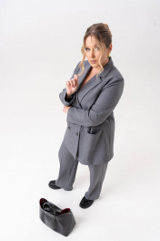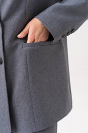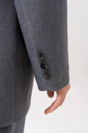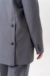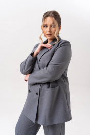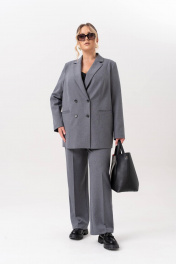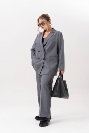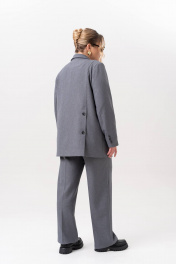 Элегантный женский костюм, в котором классика встречается с современными акцентами. Жакет выполнен в двубортном исполнении с выразительным пиджачным воротником, подчеркивающим строгость и стиль. Рельефы на полочках от плечевого шва придают силуэту структурность, а прорезные карманы в листочку добавляют практичности и утонченности. Особое внимание привлекает спинка: асимметричный рельеф на правой части, переходящий в шлицу, оформленную декоративными пуговицами — неожиданный и эффектный штрих. Втачные двухшовные рукава завершены аккуратными шлицами с тремя пуговицами, что добавляет костюму благородства и внимания к деталям. Брюки — лаконичные, с функциональными карманами и гульфиком на молнии. Удобный пояс с эластичной тесьмой по бокам делает посадку комфортной, не нарушая внешней строгости образа. Этот костюм — идеальное сочетание женственности, силы и комфорта. Он подойдет как для деловой встречи, так и для повседневного выхода, где важна уверенность и стиль. Длина рукава - 62 Длина брюк - 105 Длина жакета - 77