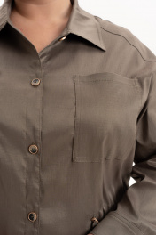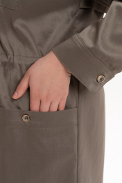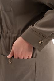 Платье офисное повседневное представляет собой идеальный выбор для женщин ищущих комфорт и стиль в ежедневной одежде. Это платье-плащ с застёжкой на петли и пуговицы, поясом на кулисе, добавляющими удобство в носке и возможность адаптации к различным фигурам. Благодаря универсальности, наряд можно носить и на работу, в офис, на прогулку и в ресторан. По спинке имеется средний шов, шлица и отлитная кокетка в верхней части спинки. Особенностью этой модели является декоративная кокетка , напоминающая плащ. Длинные рукава с манжетами и патами на петли и пуговицы, что позволяет регулировать длину рукава, гармонично дополняют классический фасон платья с воротником рубашечного типа. Большие накладные карманы и маленькие нагрудные по переду платья добавляют удобства в носке.Свободный оверсайз силуэт делает это платье универсальным. Такое платье призвано подчеркнуть природную женскую красоту и грацию, а также безупречный вкус его обладательницы. Длина изделия - 115 Длина рукава - 61