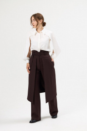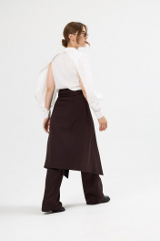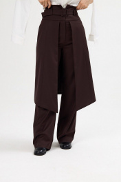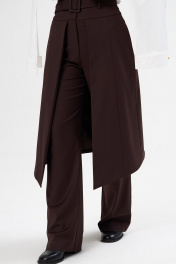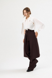 Брюки женские прямые с декоративным фигурным элементом-юбкой и с завышенной талией из костюмной поливискозной ткани. Застёжка на молнию спереди. На задних половинках брюк талиевые вытачки. Декоративный несъёмный элемент- юбка с рельефами спереди и сзади, с фигурным низом, с функциональными карманами в боковых швах, полностью на подкладке. Брюки на притачном фигурном поясе со шлёвками и съёмным поясом с обтяжной пряжкой из основной ткани.
