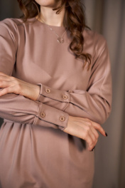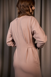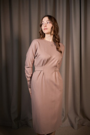 Платье женское прилегающего силуэта из плательной трикотажной ткани, длиной миди с цельнокроенным длинным рукавом на манжете. По переду вставлены поясочки с переходом на спинку, за счёт которых платье приталено. В боковых швах имеются функциональные карманы.Спинка со средним швом, шлицей и застёжкой на потайную молнию. Вырез горловины круглый