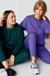 Спортивный костюм идеальное решение для активной жизни.Костюм выполнен из трикотажного полотна и состоит из бомбера и брюк.Бомбер свободного силуэта,перед и спинка цельные.Горловина овальной формы в которую вставлен плосколежащий воротник-стойка из довяза.Линия плеча спущена.Рукав одношовный,втачной,длинный.На рукавах две складки по шву.Низ рукава на манжетах.К низу бомбера вставлена широкая планка. Брюки силуэта "бананы" с манжетами по низу и отрезным поясом на резинке. В пояс вставлены декоративный шнур.В брюках имеются карманы с наклонной линией входа. Длина бомбера по спинке: 64 см Длина рукава от горловины: 75 см Длина рукава от проймы: 52 см Длина брюк по боковому шву без пояса: 96 см