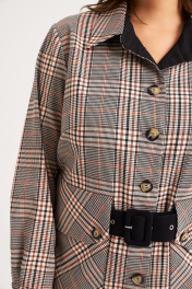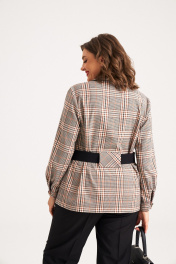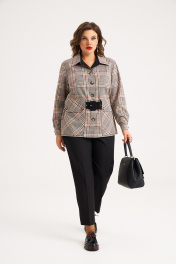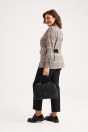 Комплект женский, состоит из жакета и брюк. Жакет выполнен из текстильной ткани без подкладки, прямого силуэта. На переде жакета расположена нагрудная вытачка, в качестве декора используются накладные карманы с клапаном, который застёгивается на кармане на две петли-пуговицы, также клапан служит широкой шлёвкой для пояса. На спинке расположена широкая шлёвка для пояса. Рукав рубашечного типа, внизу на манжете, которая застёгивается на петлю-пуговицу. Воротник стояче-отложной на притачной стойке, застёжка центральная бортовая, застёгивающаяся на петли-пуговицы. В качестве декора жакета используется съёмный пояс из отделочной ткани с обтяжной пряжкой и металлическими люверсами. Брюки классические, на притачном поясе, выполнены из однотонной текстильной ткани. По переду и спинке брюк заутюжены стрелки и имеются талиевые вытачки. Застёжка - гульфик спереди на тесьму молнию и на поясе петля-пуговица. По спинке в пояс вставлена эластичная резинка, для удобства посадки на разные фигуры и настрочены шлёвки. Комплект необычный, удобный, не сковывает движения, может подойти , как для повседневной носки, прогулок, так и для работы в офисе и школах. Длина жакета по спинке от воротника 68 см, длина рукава с манжетой 60 см. Длина брюк по боковому шву с поясом 101 см Параметры модели в 50 размере: ОГ 108 см, ОТбрюк 84см, ОБ брюк 112; параметры в 52 размере ОГ 112см, ОТ 88см, ОБ 116; параметры в 54 размере ОГ 116см, ОТ 92см, ОБ 120.