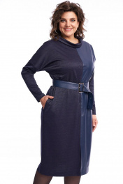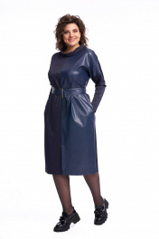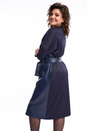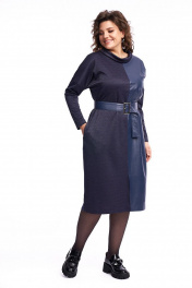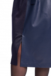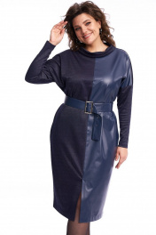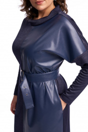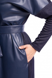 Платье женское А-силуэта. Выполнено из двух видов ткани. По переду имеется средний шов, внизу которого шлица. Левая половина переда выполнена из экокожи. Линия плеча спущена, рукав втачной одношовный. Воротник - невысокий хомутик. В качестве декора используется съемный пояс из экокожи, который застегивается на металлическую пряжку. Платье очень красивое, стильное, необычное, может быть как нарядное, так и для работы в офисах или школах. Силуэт платья стройнит, не сковывает движения. Длина платья 109 см, длина рукава от горловины 68 см.