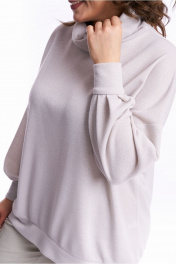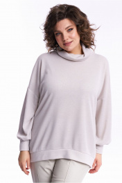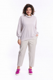 Комплект женский, состоящий из джемпера и брюк. Джемпер выполнен из трикотажного полотна с металлической ниткой, прямого силуэта, перед которого короче спинки, с притачными планками по низу. Линия плеча джемпера спущена, рукав втачной внизу с односторонними складками и притачной манжетой. Воротник высокая стойка, неплотно прилегающая к шее. Брюки классической формы, укороченные и чуть зауженные к низу, на притачном поясе, выполнены из экокожи. По переду и спинке брюк застрочены стрелки и имеются талиевые вытачки. Застёжка гульфик. В пояс спинки вставлена эластичная резинка, для удобства посадки на разные фигуры, застегивается пояс на петлю-пуговицу . Комплект необычный, удобный, не сковывает движения, может подойти, как для повседневной носки, прогулок, так и для работы в офисе и школах. Длина джемпера по спинке 70 см, длина рукава от горловины 73 см. Длина брюк по боковому шву с поясом 96 см.