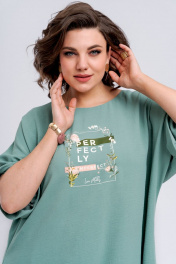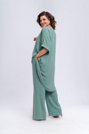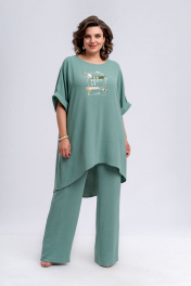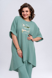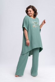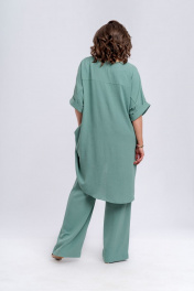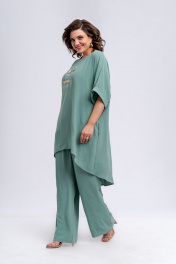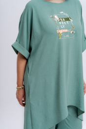 Комплект женский, состоящий из длинной блузки и брюк. Блузка полуприлегающего силуэта, расклешенная к низу. По длине перед блузки короче спинки. Линия плеча спущена. По пройме расположены притачные манжеты из основной ткани. Вырез горловины в виде лодочки. В боковых швах блузки имеются карманы. В качестве декора по переду расположена термоапликация. По спинке блузки имеется отрезная кокетка. Брюки широкие и прямые. По передней части брюк расположены односторонние складки. Пояс по спинке и по переду частично на эластичной резинке, для удобства посадки на разные фигуры. По переду брюк расположена застежка в виде гульфика с тесьмой-молнией. Пояс брюк по переду застегивается на петлю-пуговицу. Комплект необычный, оригинальный, удобный, не сковывает движения, может подойти, как для повседневной носки, прогулок, так и для работы и для торжеств. Длина блузки по спинке 101 см, длина рукава по плечевому шву 39 см. Длина брюк по боковому шву 106 см.