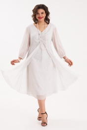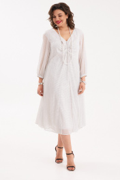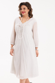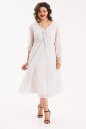 Платье женское полуприлегающего силуэта, расклешенного к низу от талии, на подкладке. По переду и спинке платье отрезное по линии талии. Верхняя часть переда со средним швом, в котором отстрочена кулиса, стягивающаяся на шнур из основной ткани с наконечниками на концах. По нижней части переда расположены талиевые вытачки. По шву талии спинки вставлена резинка. По переду и спинке нижние части платья двойные, верхний слой длиннее нижнего, по переду верхний слой разрезной по центру. Вырез горловины V-образный. Рукав втачной, внизу на резинке. Платье очень женственное, удобное, не сковывает движения, подчеркивает достоинства и скрывает недостатки. Может подойти на все случаи в жизни, как для вечерних прогулок по городу, так и для торжеств. Длина платья по спинке 111 см, длина рукава 47 см.