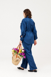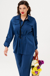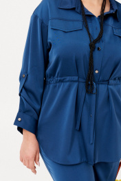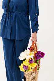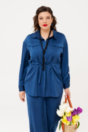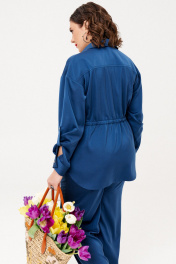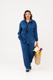 Эффектный брючный костюм состоит из жакета-рубашки, брюк .Жакет-рубашка свободного силуэта со спущенной линией плеча. Центральная застежка-планка на петли и пуговицы. Линию талии подчеркивает кулиска. Низ фигурной формы.Кокетки по переду и спинке.Рукав длинный, заканчивается притачной манжетой.Воротник рубашечного покроя на обрезной стойке. Брюки расширенные от бедра, широкие внизу, на притачном поясе без застежки, по линии талии резинка и шнурок. Карманы в боковых швах. 50 размере:жакет ОГ-113см,ОБ 118см, длина 74см; брюки ОТ-92см, растягивается до 100см, длина 103 см; в 52 размере: жакет ОГ-117см,ОБ 122см, длина 74см; брюки ОТ-96см, растягивается до 104см, длина 103 см; , в 54 размере: жакет ОГ-121см,ОБ 126см, длина 74см; брюки ОТ-100см, растягивается до 108см, длина 103 см; .