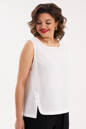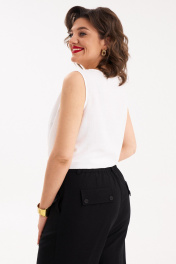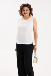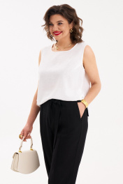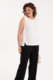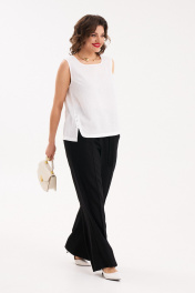 Стильный, легкий комплект состоит из брюк и топа. В комплекте топ - блузка без рукавов с интересным фигурным низом, разной длиной переда и спинке. Стильные, удобные брюки станут идеальным базовым предметом вашего гардероба. Брюки прямые, широкие. По переду защипы, на застежке, в боковых швах внутренние карманы. На задних половинках брюк декоративные клапаны.По линии талии притачной пояс со шлевками и резинкой сзади. По переду оригинальная застежка на пояс полукольцами.Брюки отлично смотряться на любом типе фигуры и удачно сочетаются как с рубашкой, блузой так и с жакетом. Каждую вещь комплекта можно носить, как самостоятельную. 50 размер: ОГ 106 см, ОБ 118 см, длина 60 см, ОТ 86-100 см, ОБ 110 см, длина 104 см; 52 размер: ОГ 110 см, ОБ 122 см, длина 60 см, ОТ 90-104 см, ОБ 114 см, длина 104 см; 54 размер: ОГ 114 см, ОБ 126 см, длина 60 см, ОТ 94-108 см, ОБ 118 см, длина 104 см