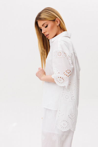 Рубашка свободного силуэта,с центральнобортовой застежкой на петли пуговицы.Воротник на стойке отложной. Спинка на кокетке,рукав короткий .