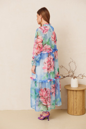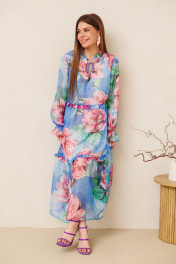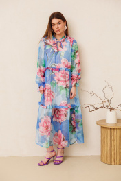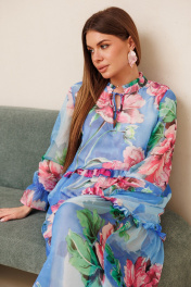 Платье свободного кроя А силуэта. Воротник планка с притачной рюшей, по переду горловины вырез, застежка на завязку. Рукав втачной длинный, по низу рукава резинка. По переду и спинке подрезы с отделочными рюшами на сборке,