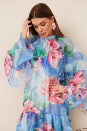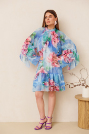 Платье из шифона. Платье расширенного А-силуэта. Воротник-стойка с застежкой по спинке на воздушные петли и металлические пуговицы на ножке. По переду и спинке отлетные кокетки фигурной формы, со сборкой по срезу горловины. По спинке в среднем шве потайная молния. По низу платья два волана со сборкой по верхнему срезу. Рукав реглан, длинный, со сборкой по горловине. По рукаву по спирали вставлен волан. Платье на подкладке.