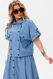 Жакет женский двубортный прямого силуэта с цельнокроеным рукавом.Рукав короткий с отложной манжетой на пате.По переду накладные карманы с клапаном.Спинка со швом. Юбка женская А-силуэта на ШИРОКОМ поясе.По переду вертикальная застежка на кнопки.в БОКОВЫХ ШВАХ ДЕЙСТВУЮЩИЕ КАРМАНЫ