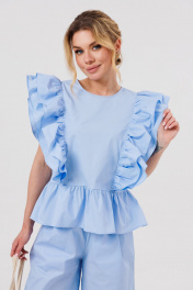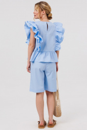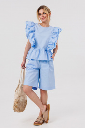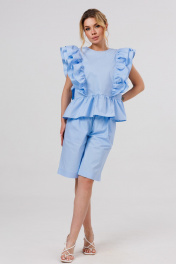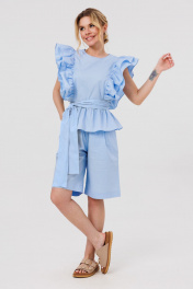 Блузка женская свободного силуэта,с рюшей по линии талии.По переду и спинке лифа рельефы с двумя притачными рюшами.По спинке вырез "Капелька" с застежкой на кнопку.Шорты свободного силуэта с притачным поясом на резинке .