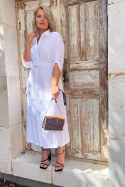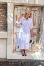 Платье из хлопковой ткани «шитьё» на подкладке, длинной миди, приталенного силуэта. Платье отрезное выше линии талии. По полочке лифа отрезные кокетки, по подрезу обработана встречная складка. Застёжка центральная на притачных планках, застегивающихся на петли и пуговицы. По спинке лифа талевые выточки. Юбка платья А-силуэта, в боковых швах обработаны карманы. Воротник рубашечный. Рукава втачные с патой для фиксации в подогнутом виде. Платье с отлетным поясом из основной ткани.