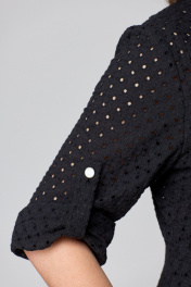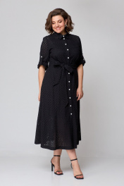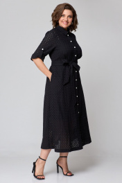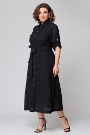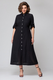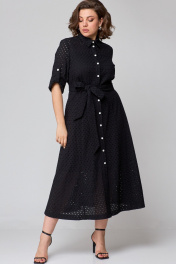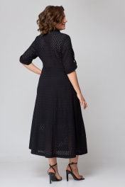 Платье из хлопковой ткани «шитьё» на подкладке, длинной миди, приталенного силуэта. Платье отрезное выше линии талии. По полочке лифа отрезные кокетки, по подрезу обработана встречная складка. Застёжка центральная на притачных планках, застегивающихся на петли и пуговицы. По спинке лифа талевые выточки. Юбка платья А-силуэта, в боковых швах обработаны карманы. Воротник рубашечный. Рукава втачные с патой для фиксации в подогнутом виде. Платье с отлетным поясом из основной ткани.
