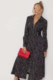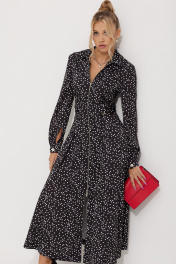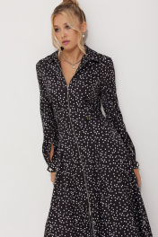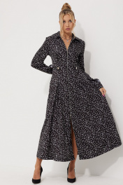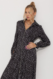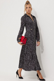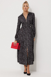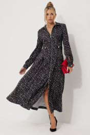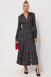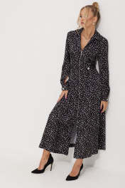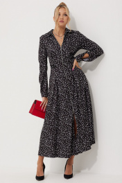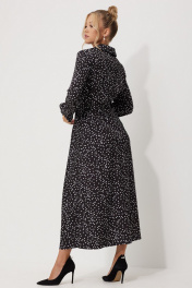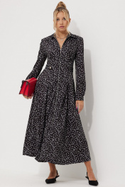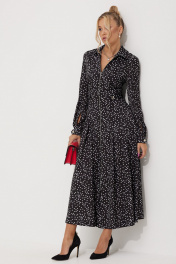 Платье женское полуприлегающего силуэта длинной миди из плательной струящейся ткани с рисунком горох. По линии талии по полочке обработаны односторонние складки. По спинке обработана кокетка и талевые выточки для более идеальной посадки. Застежка центральная на разъёмную тесьму-молнию, воротник рубашечный. По линии талии по бокам паты, застёгивающиеся на петли и пуговицы. В боковых швах обработаны карманы. Рукава длинные, втачные двухшовные по низу притачная манжета на петлю и пуговицу.