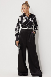Стильный комбинезон полуприлегающего силуэта с расширенными к низу брюками из легкой струящейся ткани. Лиф с центральной потайной застежкой на петли и пуговицы, вороник рубашечный. По линии талии лифа сборка для лучшей посадки. Лиф соединён с брюками притачным поясом с резинкой на уровне бокового шва и шлёвками для ремня (ремень в комплект не входит). По среднему шву спинки потайная молния от горловины. По брюкам обработан карман с отрезным бочком. Рукава длинные втачные по низу обработана притачная манжета на петлю и пуговицу.