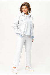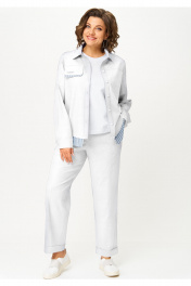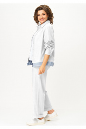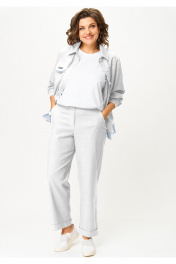 Костюм брючный полуприлегающего силуэта, состоящий из рубашки и брюк. По полочке обработаны кокетки с левой стороны в шов притачивания кокетки вставлен клапан из основной и отделочной ткани задекорированный нашивкой. Застежка центральная на притачных планках, застегивающихся на петли и пуговицы. Воротник рубашечного типа. По спинке обработана кокетка и складка для удобства в носке. Рукава длинные втачные по низу притачная манжета, застегивающаяся на петлю и пуговицу. По низу рубашки имитация двойного изделия из отделочной ткани. Швы отстрочены контрастными нитками. Брюки прямого силуэта по низу обработана манжета с отворотом. По передним половинкам в области бедер обработан прорезной карман, застегивающийся на молнию. Застежка центральна на молнию и петлю и пуговицу. По задним половинкам обработана фигурная кокетка и накладные карманы. Верхний срез обработан притачным поясом и шлёвками для ремня, для идеальной посадки по спинке вставлена резинка.
