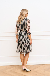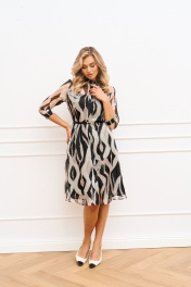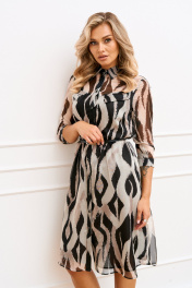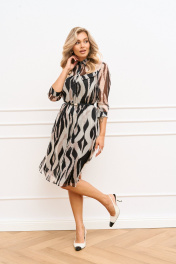 Платье полуприлегающего силуэта, слегка расширенное к низу из шифоновой ткани на подкладке длинной ниже колена будет незаменимо в теплые осенние дни. Горловина обработана рубашечным воротником, застежка центральная на притачных планках застегивающаяся на петли и пуговицы. Рукав втачной длинно 7/8 по низу притачная манжета. Платье отрезное по линии талии, для лучшего прилегания юбка платья присборена, по полочке кокетка в шов притачивания которой вставлен клапан. Платье дополнено съемным ремешком.