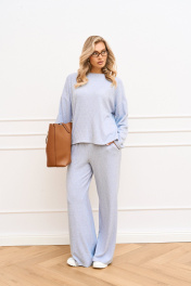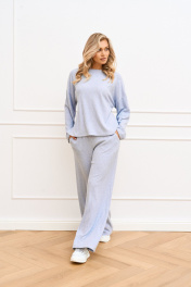 Элегантный брючный костюм в нежном цвете – идеальное решение для создания комфортного и стильного образа. Комплект состоит из свободного джемпера с длинными рукавами и широких брюк на эластичном поясе, что обеспечивает оптимальный комфорт при носке. Мягкая ткань с легким рубчатым текстурным узором добавляет изделию утонченности. Джемпер с округлым вырезом горловины, линия плеча спущена, рукав втачной, длинный, в боковых швах разрезы. Брюки-палаццо свободного силуэта, верхний срез обработан притачным поясом на эластичной тесьме, по боковым швам карманы с отрезным бочком. Этот костюм идеально подходит для релаксации дома или создания непринужденного образа для выхода в свет.
