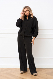 Костюм из трикотажной ткани в рубчик под штрукс, состоящий из джемпера и брюк. Джемпер прямого силуэта, по полочке обработана кокетка и в области талии накладные карманы с асимметричным краем, застежка центральная на тесьму молнию закрытая ветрозащитной планкой фиксирующаяся кнопками. Воротник стойка. Низ изделия на притачном поясе с эластичной тесьмой. Линия плеча слегка спущена, рукав втачной по низу притачная манжета с эластичной тесьмой. Брюки прямого силуэта, в боковых швах обработаны карманы. Верхний срез обработан притачным поясом по задним половинкам для лучшей посадки вставлена резинка, застегивающийся на петлю и пуговицу, застёжка центральна с гульфиком и откоском на тесьму