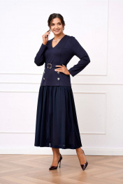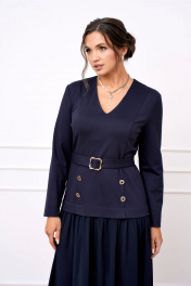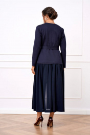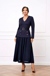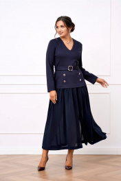 Платье женское полуприлегающего силуэта из двух видов ткани из мягкого трикотажа и струящегося шифона. Лиф платья выполнен из трикотажа, вырез горловины V-образный, по полочке обработаны рельефы, по спинке талиевые выточки. Юбка платья выполнена из шифона которая по верху присборена, благодаря чему юбка элегантно струится на фигуре, в среднем шве юбки по полочке обработан разрез. Лиф платья по полочке задекорирован четырьмя акцентными пуговицами. Платье дополнено отлетным поясом из основной ткани застёгивающимся на пряжку протяжку.