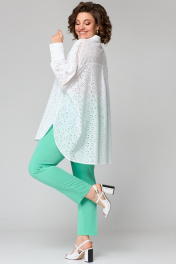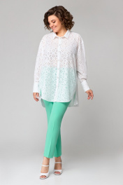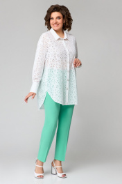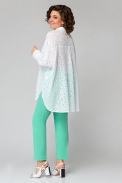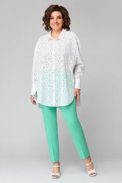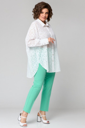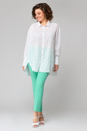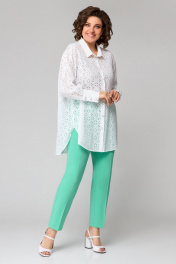 Костюм женский состоящий из рубашки и брюк из легких натуральных тканей, который будет уместен на торжестве и в повседневной носки. Рубашка свободного кроя из шитья с центральной застежкой на петли и пуговицы, воротник стойка. Линия плеча спешена, рукав втачной, по низу высокая манжета застегивающаяся на петли и пуговицы. По спинке кокетка. Низ рубашки по боковым швам скругленный. Брюки женские классического прямого кроя, по полочке и спинке заутюжены канты. В боковых швах карманы с отрезным бочком. Верхний срез брюк обработан притачным поясом застегивающийся на петлю и пуговицу, для комфортной посадки по боковым швам вставлена резинка. В среднем застежка- молния.