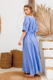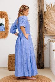 Очень эффектное льняное длинное платье с регулированием прилегания завязками по спинке. Элегантный V-образный вырез горловины, рукавчики имеют кулиску с завязочками что тоже позволяет регулировать обьем и образ. По спине на талии сборочка которая создает игривости и дополнительный шик юбке платья. Изделия бренда АМУЛЕТ создаются по славянским законам энергообережной одежды. Имеют перекидной крой и нет швов по главным энергоцентрам человека и они все пошиты закрытым способом по изнанке платья. Используется только натуральная ткань и фурнитура. В подарок платье упаковывается в шопер с символом бренда. Рост 164: ДИ 134 Рост 170: ДИ 140