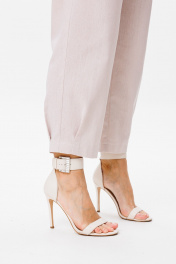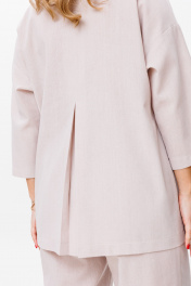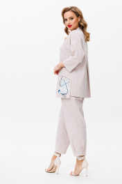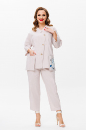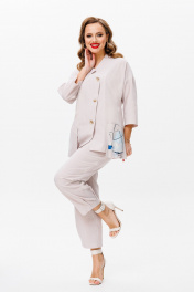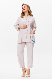 Комплект женский 2-хпредметный (жакет и брюки). Жакет из текстильной ткани прямого силуэта со спущенным плечом. По полочке идут грудовые выточки из бокового шва. Застежка ассиметричная. Воротник стойка. По спинке встречная складка. Рукав 3/4. По полочке идут отлетные накладные карманы с декором (термонаклейка). Брюки прямые, зауженные к низу за счет защипов. Пояс на резинке, по бокам карманы. Длина спинке:(48-52)-70см, (54-58)- 73см. Длина рукава:(48-58)-33см. Длина брюк (48-50) -93см, (52-58)-95см