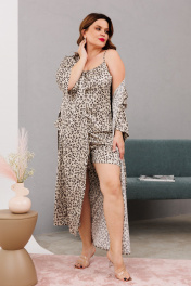 Классический костюм для дома из атласной ткани, состоящий из халата, свободного топа и коротких шортиков - комфортная одежда для сна и отдыха. Халат с запахом, на поясе. По полочке идут накладные карманы. Рукав со спущенным плечом, короткий. В сексуальной ночной пижамке удобно спать, ее можно носить дома кормящим как легкую, не стесняющую движений одежду, надевать на пижамную вечеринку. В свободном топе на тонких регулируемых бретелях со встречной складкой по центру, вставками из сетки по бокам и резинкой по верхней части спинки , и шортиках средней посадки, с резинкой на поясе - будет удобно полным и худеньким женщинам и девушкам - подросткам. Данную модель из нежной ткани можно подарить любимой маме или дочке, коллеге для повседневного ношения на лето. Длина халата 128см, длина рукава- 28. Длина топа по спинке: 34 см. Длина шорт 31 см.