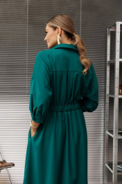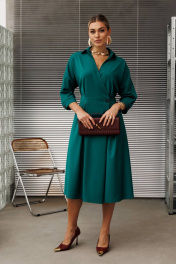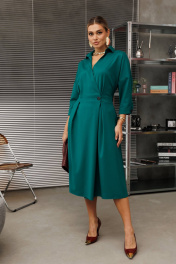 Элегантное женское палтье из костюмной ткани необычного кроя станет изюминкой вашего гардероба. Платье полуприлегающего силуэта, отрезное по линии талии со спущенным плечом. Рукав 3/4 длиный на отрезной манжете. По полочке идут защипы-складки в верхней и нижней частях, запах - на петли и пуговицы по подрезу. По нижней части платья запах идет в виде складки. По спинке кокетка со складкой, по подрезу вставлена резинка. Юбка-полусолнце с односторонними складками по полочке, по бокам карманы. По горловине воротник на отрезной стойке. Платье будет идеально смотреться с туфлями, ботинкаи и сапогами. Длина по спинке: 117см. Длина рукава с манжето 29см.
