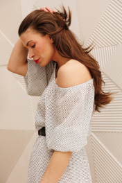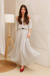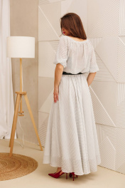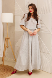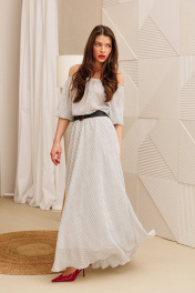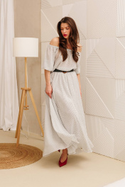 Платье макси из жатого шифона в горошек свободного силуэта - лучший выбор на лето. Рукав реглан 3/4 длины, низ на резинке. Горловина собрана на резинку. Платье отрезное по линии талии, на резинке. Юбка полусолнце на хлопковой подкладке. В комплект входит съемный пояс. ВНИМАНИЕ! Пояс может отличаться от фото. Длина юбки: 93см . Длина рукава: 43см. Длина спинки: 42см.
