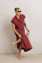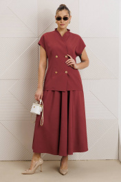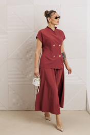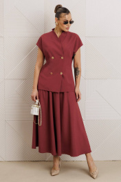 Бренд белорусской женской Anastasia представляет костюм двойку. Костюм женский 2-х предметный (жилет, юбка) из костюмной ткани станет отличным дополнением к Вашему гардеробу. Подойдет для повседневной носки (работа, офис, прогулки). Достаточно дополнить его соответствующими предметами из вашего гардероба: блузка, майка, водолазка, гольф, свитер, лонгслив, свитшот. Или акссесуарами: ремешок или пояс. Жилет полуприлегающего силуэта, со спущенным плечом. Может быть самостоятельным элементом гордерба. Застежка двухбортная. Воротник цельнокроеная стойка. По полочке идет грудовая выточка из бокового шва, по спинке средний шов. Юбка-макси, полусолнце. Пояс отрезной на резинке. По бокам - карманы. Акцентный элемент- золотые пуговицы. Благодаря своему крою и фасону костюм подчеркивает женственные формы и скрывает то, что должно быть незаметным. Это повседневный вариант на каждый день для занятий в школе или для офиса, на работу или на прогулку. Наденьте его на деловую встречу, официальное мероприятие, школьное торжество. Модель подойдёт для образа в университет или колледж. Одежда для женщин по отличным ценам и высокого качества - это Anastasia! Добавляете нас в любимые бренды и вы всегда будете в курсе всех акций и новинок! Хороших покупок от «Анастасия». Длина по спинке (48-52)-72см, (54-58)-74 см. Длина юбки (48-58) - 94см.