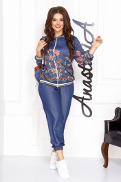 Комплект женский 2-х предметный: бомбер и брюки. Бомбер свободного силуэта из текстильной ткани "джинс" на темно- синей основе вышивка цветы. Перед и спинка цельные. Рукав длинный , одношовный, втачной. В горловину овальной формы вставлен воротник из довяза. По низу бомбера и низу рукава довяз. По переду застежка на молнию. Воротник, манжеты и пояс из довяза. Довяз может незначительно отличаться от фото. По низу брюк широкая манжета с широкой резинкой. По задним половинкам брюк выточки. На передних половинках брюк боковые карманы. По боковым швам, по входу в карман, по переднему шву и шву сидения прострочена отделочная строчка на 0,2. К верхнему срезу брюк притачен широкий пояс. Длина бомбера (с поясом): 60 см. Длина рукава (с манжетой): 60см .Длина брюк ( с поясом и манжетой) : 98 см.