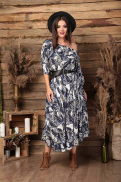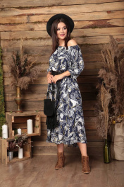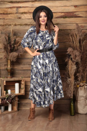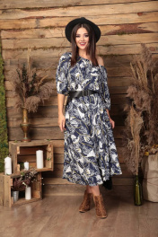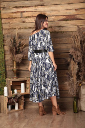 Платье свободного силуэта. На синей основе флористический рисунок. Рукав реглан 3/4 длины. Низ на резинке. Горловина собрана на резинку. Платье отрезное по линии талии, на резинке. Юбка полусолнце. Талия фиксируется сьемным поясом. Длина юбки: 82 см. Длина рукава: 45 см. Длина спинки: 42 см.