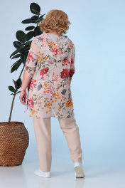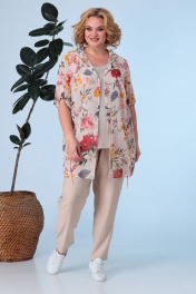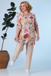Комплект женский 3-х предметный:( блузка, топ, брюки). Блуза из шифоновой ткани прямого силуэта, удлиненная, по бокам разрезы. По переду нагрудная вытачка. По спинке кокетка, чуть ниже линии талии настрочена кулиса с протянутым шнуром и с 2-мя фиксаторами. В горловину втачан капюшон. Капюшон стачной, по краю вставлена резинка. Рукав втачной, одношовный. По низу рукава -широкая подгибка и пата. По переду планка с застежкой, спинка длинее полочки. Топ из трикотажного полотна полуприлегающего силуэта, плечо немного спущенное. Брюки на резинке, зауженные к низу, по бокам карманы. Длина блузы: в р.(50,52,54)-81 см, р.(56-60)-85см, р.(62-66)-89см. Длина рукава: в р.(50,52,54)-38 см, р.(56-60)-40см, р.(62-66)-42см. Длина топа: р.(50,52, 54)-64 см, р(56-60)-66см, р(62-66)-72см. Длина брюк: р.(50,52, 54)-97 см, р.(56-60)-100см, р.(62-66)-103см.