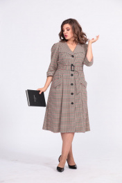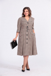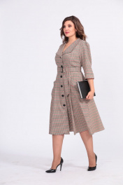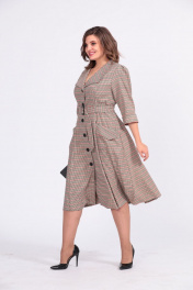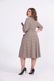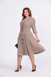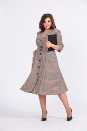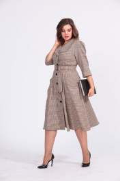 Платье из текстильной ткани "гусиная лапка", прилегающего силуэта. По полочке и спинке идут рельефы из плечевого шва, застежка на петли и пуговицы. Воротник типа "опаш", рукав 3/4 длины с отложным манжетом. По полочке карманы с отложным клапаном, платье по низу гаде. В комплекте съемный пояс. Длина платья: (50-56)- 115см., (50-62)-117 см. Длина рукава: (50-62)-45см.