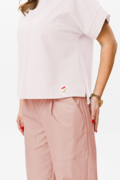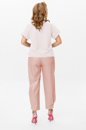 Комплект женский 2-х предметный (топ и брюки). Топ прямого силуэта из трикотажного полотна со спущенным плечом, по бокам разрезы, спинка длиннее чем полочка. По центру полочки и спинки - отделачная строчка. Рукав в виде манжены, вырез горловины в форме лодочки. В качестве отделки по низу полочки - нашивка. Брюки бананы из Эко-кожи. Укороченные, сужающиеся к низу за счет встречной складки. По переду идут подрезные карманы и складка по линии талии. Застежка на молнию. Пояс отрезной с резинкой. Топ и брюки можно легко совмещать с другими предметами вашего гардроба. Длина спинки(46-50)-55 см, (52-54)-58см. Длина рукава (манжета): (46-54)-4 см. Длина брюк: (46-50)-94см, (52-54)-96см.